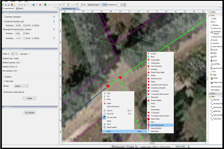 The software supports multiple irrigation methods simultaneously and allows visualization in 2D and 3D views. Users can simulate network behavior under different conditions, ensuring system reliability before installation.