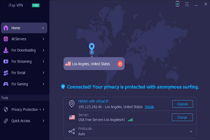 Additionally, iTop VPN Free automatically chooses the fastest server available, ensuring smooth streaming, gaming, and browsing. This combination of security and speed makes it a versatile VPN tool for Windows PCs.