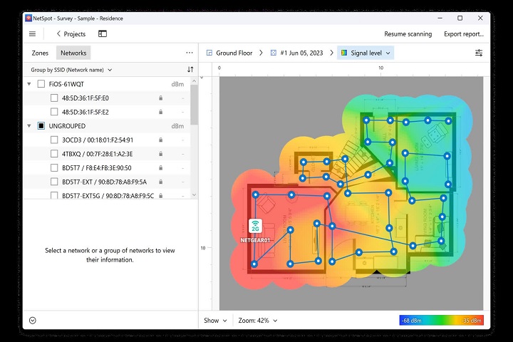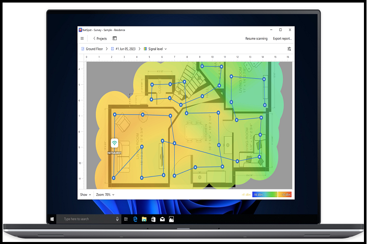 NetSpot allows users to create interactive Wi-Fi coverage maps for offices, campuses, or large buildings. By uploading floor plans or drawing layouts directly within the software, administrators can visualize access point placement, signal strength, and potential coverage gaps.