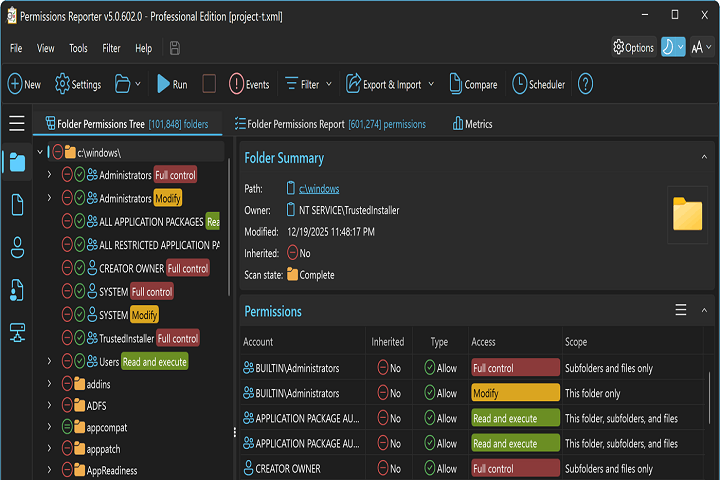 Scan and analyze permissions for files, folders, and network shares across Windows systems.